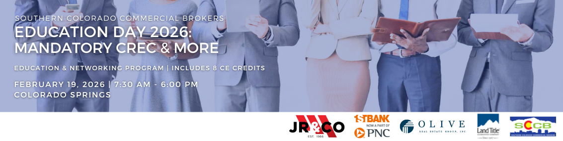 Welcome Southern Colorado Commercial Brokers! Welcome to the Southern Colorado Commercial Brokers (SCCB)! Your premier resource of real estate services for southern Colorado brokerage industry. In late 2014, Commercial real estate brokers and Realtors® in Colorado Springs and Southern Colorado formed a new non-profit professional organization, Southern Colorado Commercial Brokers (SCCB) that replaces their former group, RCIS, a committee of Pikes Peak Association of Realtors® (PPAR). SCCB’s mission is to provide commercial real estate Brokers, Realtors® and Business Affiliate organizations in the Southern Colorado region with a platform that promotes business integrity and ethical practices, and provides educational and networking opportunities, as well as accurate market information. SCCB Needs and Wants!Attention SCCB Members Only! The SCCB [email protected] email distribution is NOW available for your use! You must be a PAID SCCB Member to be included in this distribution list and/or utilize this EXCLUSIVE Needs and Wants Email Distribution List. Once your SCCB membership application is processed, you are automatically added to the distribution list. To begin using the Needs and Wants email distribution, simply add the following email address to your email contacts list and be sure to set as a "Safe Sender" - then enter this address in the recipient field. Click Here for the Needs & Wants User Guidelines! 2026 Marketing Opportunities NOW Available! Invest as a Sponsor of SCCB - your premier resource of real estate services for the Southern Colorado Brokerage Community. |
